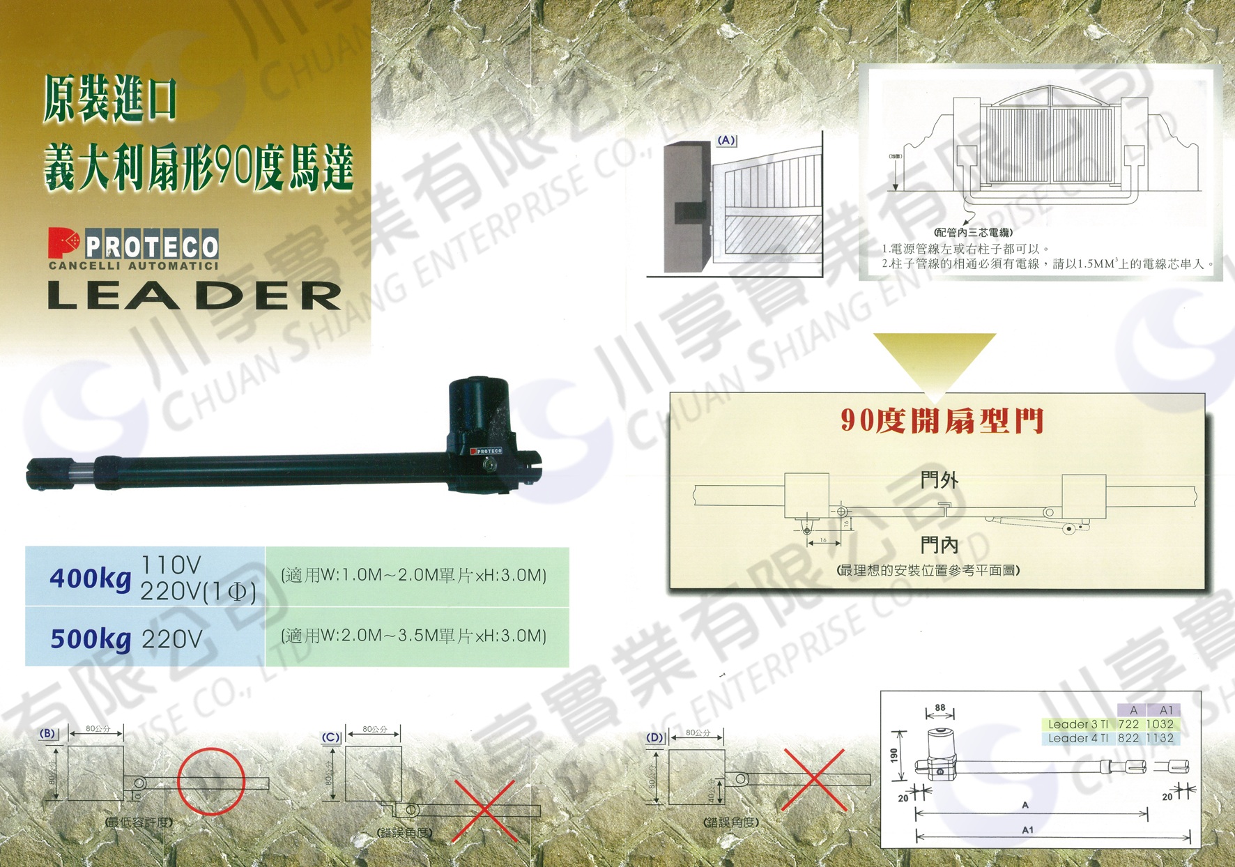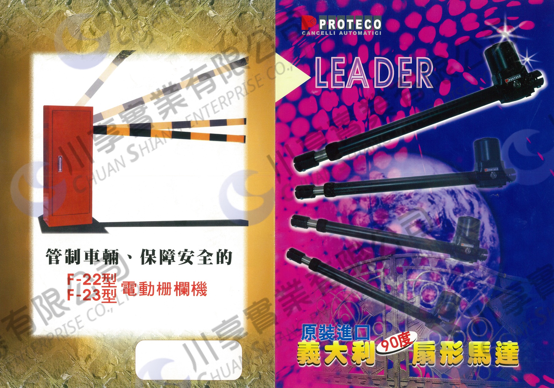 PROTECO LEADER TI 不可逆機械延伸柱塞,適用於最大3.5米的旋轉門(扇形門)。 功能強大,安靜且耐用。 銅製傳動裝置和實用的釋放手柄,有鑰匙鎖孔,開鎖後可放空檔手動推動門。 安裝快速簡單,幾乎可以安裝在任何類型的旋轉門上。 遙控器操作,讓您可以不用下車,下雨天也可輕鬆開門! 產品型錄 扇形馬達機械臂產品型錄,點擊圖片可放大。 (如圖所示另有「電動柵欄機」安裝、維修等服務)